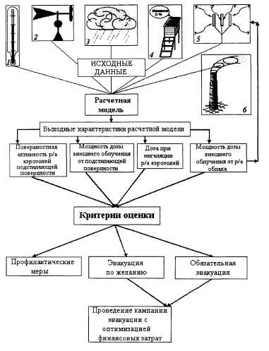 где qmax - значение концентрации в центре облака (х = 0, у = 0), σy - дисперсия распределения, то для воспроизведения функции q(x, у, t) с допустимой погрешностью δ = 50% необходимо иметь 70 точек измерения, а при δ = 30% - уже 200 точек [7]. Если учесть, что для каждого измерительного прибора необходимы линии связи, обслуживание, т.е. специальный персонал, требующий, в свою очередь, социальных затрат и т.д., нетрудно убедиться, что системы контроля, построенные по такому принципу, достаточно дорогостоящи и малоэффективны в случае аварийных ситуаций, т.к. не могут работать в режиме реального времени. 2. Экономические критерииС целью оптимального использования экспериментальных данных в последние годы была выдвинута идея сочетания измерительного и модельного мониторинга в единую систему таким образом, чтобы достоинства одного компенсировали недостатки другого [8]. Такого типа система должна обеспечивать непрерывный процесс адаптации модели распространения радиационного загрязнения среды к конкретным изменяющимся условиям по результатам фактических измерений на местности, что, в свою очередь, требует повышенной точности измерений. Повышение точности измерений возможно за счет снижения влияния внешнего и накапливающегося в точках контроля фона, исключения систематических ошибок, учета и автоматической компенсации нелинейности детекторов [9]. Важными факторами разработки систем являются экономические составляющие их создания и эксплуатации. Стоимость системы во многом определяется ценой комплектующих изделий, линий связи, монтажа и пусконаладочных работ. Повышение требований надежности, точности измерений (особенно в реальном масштабе времени), и быстродействия, расширение функций вместе с экономическими составляющими определяют требования и критерии при построении современных систем. Решение этих задач связано с определенными затратами, поэтому ведется поиск оптимального варианта их решения. Одним из наиболее важных параметров системы контроля является количество телеметрических систем, так как датчики, устанавливаемые на этих системах, дают непосредственно информацию о радиоактивном загрязнении окружающей среды и, кроме того, за счет своего количества, линий связи и необходимого технического обслуживания оказывают существенное влияние на стоимость системы в целом. 3. Физическо-технические критерииОценка радиоактивного загрязнения окружающей среды сводится к оценке загрязнения воздушного бассейна и подстилающей поверхности в направлении выброса, которые, в свою очередь, определяются величиной объемной активности радиоактивной примеси в воздухе, поверхностной активностью подстилающей поверхности при выпадении на нее радиоактивной примеси, а также мощностью дозы внешнего облучения и дозы при ингаляции в загрязненном районе. Если радионуклидный состав радиоактивной примеси известен хотя бы приблизительно (например, он может задаваться в рамках технологического регламента на АС или согласно критерию уровней аварии [7]), то использование датчиков мощности дозы внешнего облучения сети постов АСКРО, размещаемых на промплощадке АС, в СЗЗ и ЗН, позволяет уточнить величину мощности выброса и таким образом оценить масштабы радиоактивного загрязнения среды. Однако в этом случае к размещению датчиков АСКРО на промплощад