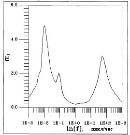 Уравнение (3) можно обобщить, если учесть, что часть примеси может вступать в реакцию с внешней средой или распадаться с постоянной времени τ, а также учесть источник рассматриваемой загрязняющей примеси, описываемый функцией f(x, y, z, t): где σ = 1/τ. Смысл величины σ становится очевидным, если в (4) положить f = 0, Ū = 0, тогда решение определяется как φ = φ0exp(-σt), если φ|t=0 = φ0, а величина τ - время, за которое концентрация примеси уменьшается в е раз. Уравнение (4) дополняется начальным условием: φ|t=0 = φ (5) и граничным условием: φ|s = φs, Un<0, (6) где S - поверхность, ограничивающая область определения искомой функции, Un - проекция вектора Ū на внешнюю нормаль к поверхности. Условие (6) задает решение на той части, где воздушные массы вместе с исследуемой примесью "втекают" в область определения функции. Рисунок 1 Спектр скорости ветра в приземном слое атмосферы [2] Точное решение задачи (4) возможно в том случае, когда известны значения функции u, v, w в пространстве и во все моменты времени. Если же информации о компонентах вектора скорости недостаточно, то в этом случае целесообразно пользоваться различными приближениями. Известно, что атмосфера является средой турбулентной, т.е. средой, в которой спонтанно образуются мелкомасштабные флуктуации (вихри), они диссипируются и создаются условия для новых образований. Спектр таких флуктуаций достаточно подробно изучался Ван дер Ховеном [2]. Результаты сводятся к следующему. Флуктуации сосредоточены, в основном, в двух четко разделяемых областях: в области крупномасштабных пульсаций (синоптическая область) с центром вблизи f1 = 0,01 цикл/час и в области мелкомасштабных пульсаций с центром около f2 = 80 цикл/час. Низкочастотная область соответствует изменениям скорости ветра, вызванным прохождением циклонов и антициклонов, высокочастотная - рассматривается как турбулентные пульсации ветра, которые можно сгладить при осреднении рис. 1 [2]. В [2] получено, что величина периода осреднения Т, при которой осредненные величины не зависят от Т, составляет »67 мин. Физика флуктуационных эффектов изучена к настоящему времени достаточно хорошо, но математическое описание до сих пор в большинстве случаев основывается на полуэмпирических соотношениях. Пусть