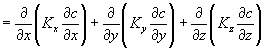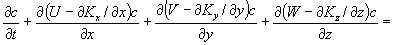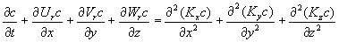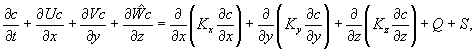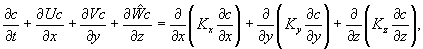 В этом уравнении Ur, Vr, Wr - компоненты регулярной скорости движения частиц как функции координат, определяемые (2а). В (6) учтено, что горизонтальные компоненты, согласно (2а), равны компонентам усредненной скорости ветра Ur = U, Vr = V. Как правило, производными от коэффициентов горизонтального турбулентного обмена по сравнению с горизонтальной скоростью ветра можно пренебречь и положить ¶Kx/¶x = ¶Ky/¶y= 0. Для вертикальной компоненты это не так. Согласно (2а): Wr = Ŵ+W'' Если выбрать W'' = ¶Kz/¶z и подставить в (6), то последнее уравнение примет следующий вид: