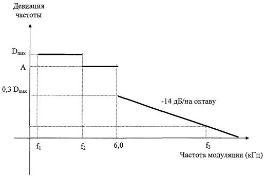 а) при частотах модулирующего сигнала в полосе от f2 до 6,0 кГц девиация частоты передатчика не превышает значения А (рисунок), измеренного на частоте f2;