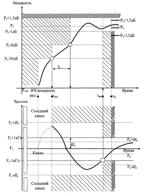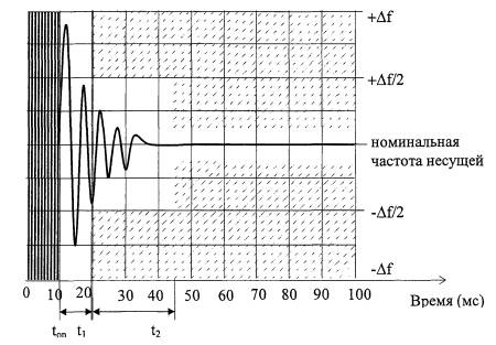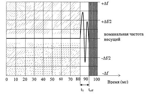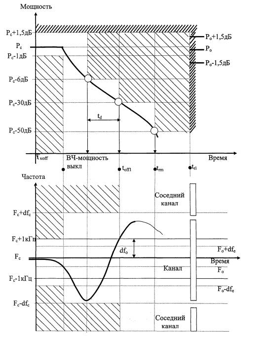 Графики переходных процессов изменения мощности и частоты несущей при выключении передатчика приведены на рисунке.