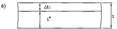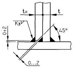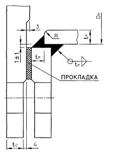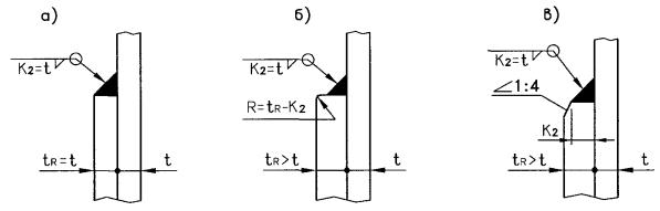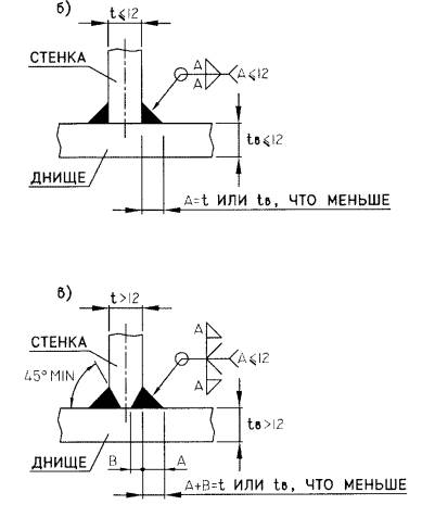 Рис. 7.1. Номинальные толщины проката конструктивных элементов резервуара, контактирующих с продуктом или его парами а) номинальная толщина пояса стенки; б) номинальная толщина элементов днища, настила крыши, патрубков типов «F» и «FP», люков; в) номинальная толщина элементов каркаса крыши, патрубков типов «S», «D», «SB» и «SP», конструкций внутри резервуара t - номинальная толщина проката, указываемая в заказе; t* - минимальная или расчетная толщина элемента; Δtm - минусовой допуск на прокат; Δtc - припуск на коррозию, назначаемый индивидуально для всех элементов резервуара, включая пояса стенки 8. Конструкции резервуаров8.1. Сварные соединения и швы8.1.1. Основные типы сварных соединений и швов Для изготовления резервуарных конструкций применяются стыковые, угловые, тавровые и нахлесточные сварные соединения. В зависимости от протяженности сварных швов по линии соединения деталей различают следующие типы сварных швов: - сплошные швы, выполняемые на всю длину сварного соединения; - прерывистые швы, выполняемые чередующимися участками длиной не менее 50 мм; - временные (прихваточные) швы, поперечное сечение которых определяется технологией сборки, а протяженность свариваемых участков составляет не более 50 мм. Конструктивные элементы сварных соединений и швов должны, как правило, соответствовать требованиям стандартов на применяемый вид сварки: - для ручной дуговой сварки - ГОСТ 5264; - для дуговой сварки в защитном газе - ГОСТ 14771; - для сварки под флюсом - ГОСТ 8713. Изображения сварных соединений и условные обозначения сварных швов на чертежах должны однозначно определять размеры конструктивных элементов подготовленных кромок свариваемых деталей, необходимые для выполнения швов с применением конкретного вида сварки. Основные типы и рекомендуемые обозначения сварных соединений и швов приведены в справочном Приложении П.3. 8.1.2. Ограничения на сварные соединения и швы Наличие прихваточных швов в законченной конструкции не допускается. Минимальные катеты угловых швов (без припуска на коррозию) должны приниматься в соответствии с таблицей 38 СНиП II-23-81* «Стальные конструкции». Максимальные катеты угловых швов не должны превышать 1,2 толщины более тонкой детали в соединении. Нахлесточное соединение, сваренное сплошным швом с одной стороны, допустимо только для соединений элементов днища или крыши (согласно п. 8.1.5 и п. 8.1.8), при этом величина нахлеста должна быть не менее 60 мм для соединений полотнищ днища или полотнищ крыши и не менее 30 мм для соединений листов днища или листов крыши при полистовой сборке, но не менее 5-ти толщин наиболее тонкого листа в соединении. 8.1.3. Вертикальные соединения стенки Вертикальные соединения листов стенки должны выполняться двусторонними стыковыми швами с полным проплавлением. Вертикальные заводские и монтажные швы стенок резервуаров 4 класса опасности, сооружаемых методом рулонирования, допускается располагать на одной линии. Для прочих резервуаров вертикальные заводские и монтажные соединения на смежных поясах стенки должны быть смещены относительно друг друга на величину не менее 10t (где t - толщина нижележащего пояса стенки), и не менее 500 мм для стенок полистовой сборки. 8.1.4. Горизонтальные соединения стенки Горизонтальные соединения листов стенки должны выполняться двусторонними стыковыми швами с пол