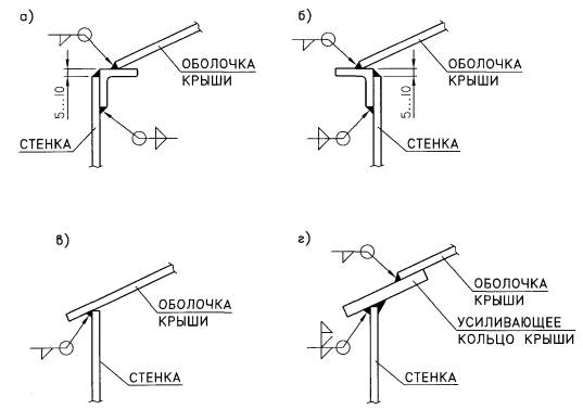 9.3.3.1.3. Если Grt = 0, или pv = 0, или ps = 0 формула 9.3.3.1.2 должна быть приведена в соответствие с полученным сочетанием нагрузок. 9.3.3.1.4. Формулы 9.3.3.1.1 применимы для углов α ≤ 30° и при выполнении условия r/(tr0 sin α) > 274, которое следует проверить после вычисления первого приближения для tr0. Поскольку рr в свою очередь зависит от предварительно неизвестной толщины tr0, для расчета требуется несколько последовательных приближений. 9.3.3.2. Узел сопряжения крыши и стенки 9.3.3.2.1. Узел крепления крыши к верху стенки должен выполняться по одному из вариантов, приведенных на рис. 9.3. В расчетное сечение включается кольцевой элемент жесткости, а также прилегающие участки крыши и стенки. 9.3.3.2.2. Узел сопряжения крыши со стенкой должен быть рассчитан на прочность при действии кольцевого растягивающего усилия, возникающего от нагрузок расчетных сочетаний 1, 3 (таблица П. 4.2 Приложения П.4). При этом размеры поперечного сечения должны удовлетворять условию: