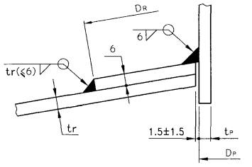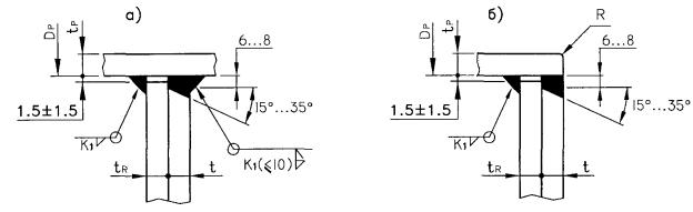 Рис. 8.3. Соединение каркасных конических или купольных крыш со стенкой При выполнении крыши во взрывозащищенном исполнении должны соблюдаться следующие требования: - приварка настила должна выполняться в соответствии с п. 8.1.8; - площадь поперечного сечения узла сопряжения крыши со стенкой должна определяться в соответствии с требованиями раздела 9.3.5. Каркасные конические крыши могут изготовляться в виде щитов, состоящих из соединенных между собой элементов каркаса и настила или раздельно - из элементов каркаса и настила, не приваренного к каркасу. В последнем случае настил может выполняться из отдельных листов, крупногабаритных карт или рулонируемых полотнищ, а два диаметрально-противоположных элемента каркаса должны быть раскреплены в плане диагональными связями. 8.5.5. Каркасная купольная крыша Купольная крыша представляет собой радиально-кольцевую каркасную систему, образующую поверхность сферической оболочки. Купольные крыши рекомендуются для резервуаров объемом свыше 5000 м3 диаметром от 25 м до 50 м. Купольные крыши должны отвечать следующим требованиям: - радиус кривизны сферической поверхности крыши должен быть в пределах от 0,8 D до 1,5 D, где D - диаметр резервуара; - номинальная толщина настила должна составлять не менее 5 мм, включая припуск на коррозию. Каркасные купольные крыши могут изготавливаться в виде щитов, состоящих из соединенных между собой элементов каркаса и настила или раздельно из элементов каркаса и настила, не приваренного к каркасу. В последнем случае настил может выполняться из отдельных листов или крупногабаритных карт, а каркас должен иметь не менее четырех связевых блоков, расположенных в плане ортогонально. Опирание крыши на стенку резервуара рекомендуется выполнять с устройством опорного кольца по рис. 8.3 г. 8.6. Патрубки и люки в стенке резервуара (врезки в стенку)Установка патрубков и люков в стенке, с учетом конструктивных решений, мест расположения, применяемых материалов и прочих требований настоящего Стандарта, не должна снижать показатели прочности, герметичности, надежности и долговечности резервуара. Для изготовления патрубков и люков должны использоваться бесшовные или прямошовные трубы и изготовленные из вальцованного листа обечайки. Продольные швы обечаек, изготовленных из вальцованного листа, должны быть проконтролированы методом радиографирования в объеме 100 %. Для резервуаров 4 класса опасности радиографию допускается не проводить. При выполнении приварки трубы или обечайки к стенке резервуара должно быть обеспечено полное проплавление стенки. 8.6.1. Усиления стенки в местах врезок Отверстия в стенке для установки патрубков и люков должны быть усилены листовыми накладками (усиливающими листами), располагаемыми по периметру отверстия. Допускается установка патрубков условным проходом до 65 мм включительно в стенке толщиной не менее 6 мм без усиливающих листов. Наружный диаметр DR усиливающего листа должен находиться в пределах 1,8 D0 ≤ DR ≤ 2,2 D0, где D0 - диаметр отверстия в стенке. Толщина усиливающего листа должна быть не менее толщины соответствующего листа стенки, исключая припуск на коррозию, и не должна превышать толщину листа стенки более чем на 5 мм. Кромки усиливающего листа толщиной, превышающей толщину листа стенки, должны быть скруглены или обработаны в соответс