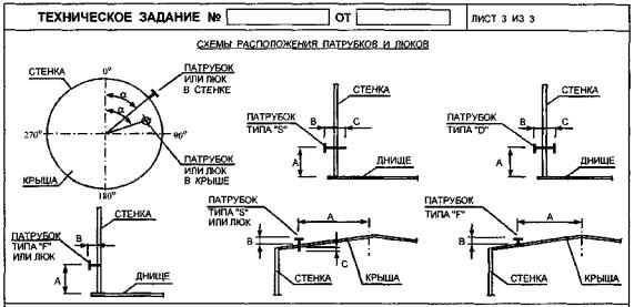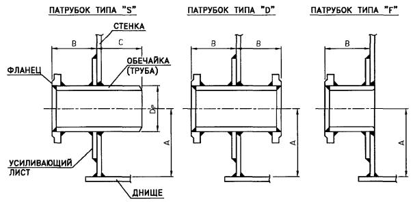 Люки-лазы, как правило, должны быть снабжены приспособлением (поворотным устройством) для облегчения открывания и закрывания крышки. По согласованию с Заказчиком конструктивное исполнение люков-лазов может выполняться в соответствии со стандартом API 650. 8.7. Патрубки и люки в крышеКоличество и размеры патрубков, служащих для установки различных устройств или оборудования на стационарной крыше резервуара зависят от назначения и объема резервуара и назначаются Заказчиком резервуара. Рекомендуются патрубки условным проходом 50; 80; 100; 150; 200; 250; 300; 350; 400; 500 мм. Конструктивное исполнение патрубков в крыше должны соответствовать рис. 8.8; 8.12; 8.13 и таблице 8.6. ПАТРУБОК ТИПА «S» ПАТРУБОК ТИПА «F»