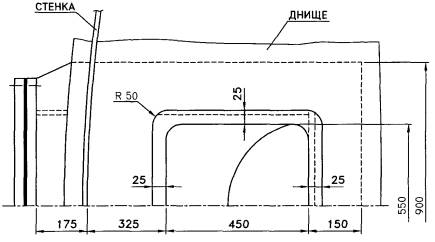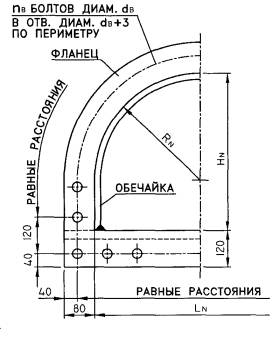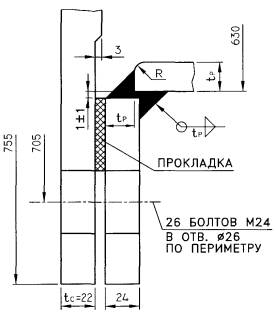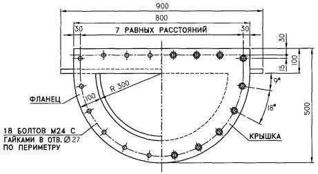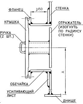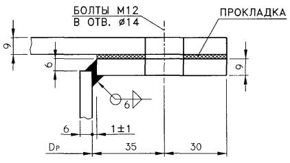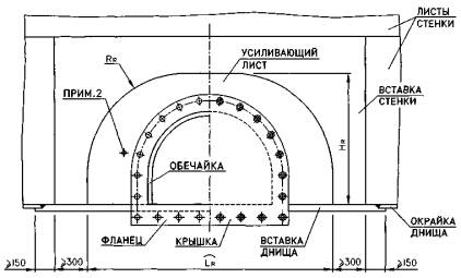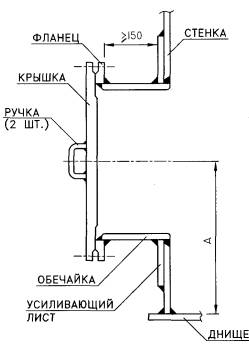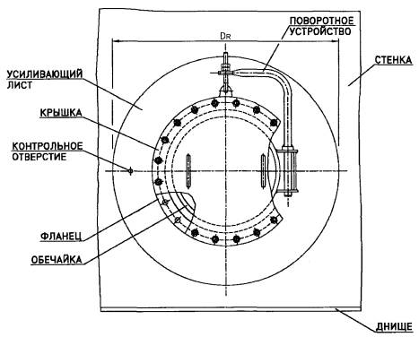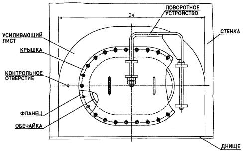 Примечания: 1. Поверхности, прилегающие к прокладке, обработать до RA ≤ 12,5 мкм. 2. Усиливающий лист должен иметь контрольное отверстие М6...М10. 3. Все кромки и углы внутренней поверхности скруглить радиусом не менее 3 мм. 4. Внутренние швы должны быть гладко зашлифованы. Рис. 8.21. Придонный очистной люк