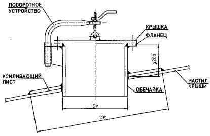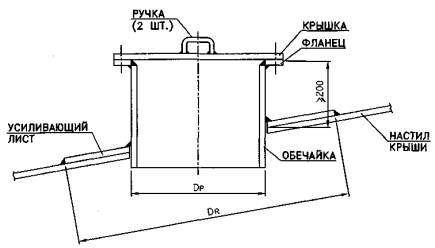 Если патрубок используется для вентиляции, обечайка (труба) должна быть обрезана снизу заподлицо с настилом крыши (тип «F»). Фланцы патрубков в крыше должны выполняться по ГОСТ 12820 (исполнение 1 по ГОСТ 12815) на условное давление 0,25 МПа, если иное не оговорено при заказе резервуара. По требованию Заказчика патрубки в крыше резервуаров без понтонов, эксплуатируемых при избыточном давлении в газовом пространстве, могут комплектоваться временными заглушками на условное давление Ру = 0,25 МПа, предназначенными для герметизации резервуара при проведении испытаний после окончания монтажа. Для осмотра внутреннего пространства резервуара, его вентиляции при проведении внутренних работ, а также для различных монтажных целей каждый резервуар должен быть снабжен не менее, чем двумя люками, установленными в крыше. Рекомендуются люки условным проходом 500, 600, 800 и 1000 мм. Конструктивное исполнение люков должно соответствовать рис. 8.13, 8.14 и таблице 8.7. СВЕТОВОЙ ЛЮК