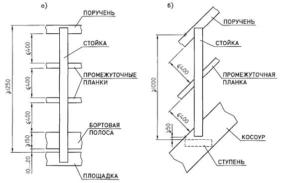 Рис. 8.15. Ограждения площадок и лестничных маршей 8.9. Понтоны8.9.1. Понтоны применяются в резервуарах для хранения легко испаряющихся продуктов и предназначены для сокращения потерь от испарения. Понтоны должны отвечать следующим основным требованиям: - понтон должен максимально перекрывать поверхность хранимого продукта; - резервуары с понтоном должны эксплуатироваться без внутреннего давления и вакуума в газовом пространстве резервуара; - все соединения понтона, подверженные непосредственному воздействию продукта или его паров, должны быть плотными и проконтролированы на герметичность; - любой материал, уплотняющий соединения понтона, должен быть совместим с хранимым продуктом. 8.9.2. Применяются следующие основные типы понтонов: - понтон однодечной конструкции, имеющий центральную однослойную мембрану (деку), разделенную, при необходимости, на отсеки, и расположенные по периметру кольцевые короба (открытые или закрытые сверху); - понтон двудечной конструкции, состоящий из герметичных коробов, расположенных по всей площади понтона; - понтон на поплавках с герметичным настилом; - многослойный понтон, включающий металлическую мембрану, покрытую слоем пенополиуретана толщиной не менее 40 мм с металлической или полиуретановой обшивкой. 8.9.3. Конструкция понтона должна обеспечивать его нормальную работу по всей высоте рабочего хода без перекосов, вращения во время движения и остановок. 8.9.4. Борт понтона и бортовые ограждения всех устройств, проходящих через понтон (опор стационарной крыши, направляющих понтона и пр.) с учетом расчетного погружения и крена понтона в рабочем состоянии (без нарушения герметичности отдельных элементов) должны превышать уровень продукта не менее чем на 150 мм. Такое же превышение должны иметь патрубки и люки в понтоне. 8.9.5. Пространство между стенкой резервуара и бортом понтона, а также между бортовыми ограждениями и проходящими сквозь них элементами должно быть уплотнено при помощи специальных устройств (затворов). 8.9.6. Материал затворов должен выбираться после рассмотрения таких параметров, как температура района строительства резервуара, температура хранимого продукта, проницаемость парами хранимого продукта, прочность на истирание, старение, хрупкость, воспламеняемость и других факторов совместимости с хранимым продуктом. 8.9.7. Понтон должен быть сконструирован таким образом, чтобы номинальный зазор между понтоном и стенкой резервуара составлял около 200 мм с допускаемым отклонением ±100 мм. Величина зазора должна устанавливаться в зависимости от конструкции применяемого затвора. 8.9.8. Материал стальных конструкций понтона относится к подгруппе Б2 по п. 7.1.1. 8.9.9. Номинальная толщина стальных элементов понтона должна быть не менее 4 мм. При использовании в понтонах стальных элементов с металлизационными покрытиями или алюминиевых сплавов, их толщина должна определяться на основании прочностных и деформационных расчетов, а также с учетом коррозионной стойкости. 8.9.10. Понтон должен иметь опоры, позволяющие фиксировать его в двух нижних положениях - рабочем и ремонтном. Рабочее положение определяется минимальной высотой, при которой конструкции понтона отстоят не менее чем на 100 мм от верхних частей устройств, находящихся на днище или на стенке резервуара и препятствующих дальнейшему опуск