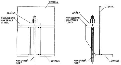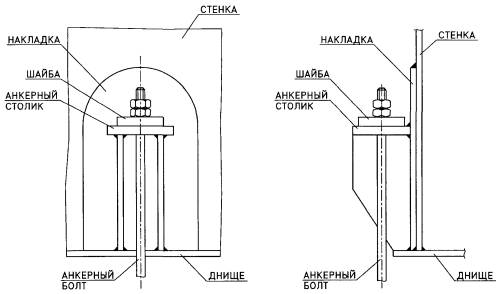 Рис. 8.16. Крепление стенки анкерными болтами 8.11.4. Расчет анкерного крепления должен выполняться таким образом, чтобы при чрезмерных нагрузках на резервуар, превышающих расчетные, происходило разрушение анкерного болта, но не опорного столика и швов его соединения со стенкой резервуара. Допустимая величина растягивающего напряжения в анкерных болтах не должна превышать половины предела текучести или одной трети временного сопротивления материала болта. 8.11.5. Анкерные болты должны быть равномерно затянуты при полном заливе резервуара водой по окончании гидравлических испытаний, но перед созданием внутреннего избыточного давления. Расчетное усилие затяжки анкерных болтов должно составлять около 2100 Н. Усилие затяжки должно назначаться в проекте КМ. Должны быть предусмотрены средства для предотвращения отвинчивания гаек с помощью таких способов, как проковка резьбы или установка контргаек. Диаметр анкерных болтов должен быть не менее 24 мм. 8.11.6. Анкерные крепления должны располагаться равномерно по периметру стенки. Расстояние между анкерными болтами должно не превышать 3 м, за исключением резервуаров диаметром до 15 м при их расчете на сейсмику, когда указанное расстояние должно не превышать 2 м. Количество анкерных болтов, устанавливаемых на резервуаре, должно быть кратно четырем. Анкерные болты должны располагаться симметрично относительно главных осей резервуара и не совпадать с главными осями на плане. 8.11.7. По согласованию с Заказчиком допускается выполнять анкерные крепления стенки резервуара с применением анкерных полос, как это показано на рис. 8.17. Монтажные стыки анкерных полос должны выполняться в момент времени, соответствующий натяжению анкерных болтов по п. 8.11.5. 8.12. Конструкции для зачисткиПо требованию Заказчика резервуар может комплектоваться конструкциями для зачистки, служащими для выполнения следующих операций: - удаление донного осадка (отложений), образовавшегося в период эксплуатации резервуара; - удаление остатков (придонного слоя) продукта; - удаление подтоварной воды; - удаление атмосферной воды из межстенного пространства резервуаров с защитной стенкой. Обозначения всех размеров, приведенных в разделе 8.12, указаны на рис. 8.19-8.21.