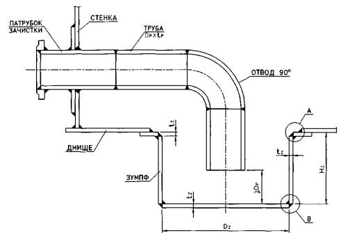 Рис. 8.18. Патрубки зачистки с отводом 8.12.1. Патрубки зачистки с отводом Патрубки зачистки с отводом служат для удаления из резервуара остатков продукта и подтоварной воды. Патрубки изготавливаются условным проходом 100, 150, 200 и 250 мм. Конструкция патрубков должна соответствовать рис. 8.18. 8.12.2. Круглые зумпфы зачистки Круглые зумпфы зачистки служат для удаления из резервуара донного осадка, остатков продукта и подтоварной воды. Круглые зумпфы изготавливаются следующих размеров (диаметр × глубина): Ø 600 × 300, Ø 900 × 450, Ø 1200 × 600, Ø 1500 × 900 для патрубков зачистки, соответственно, Dy50, Dy80, Dy100 и Dy150. Конструкция круглых зумпфов зачистки должна соответствовать рис. 8.19 и таблице 8.8. Необходимость установки, конструкция и требуемое количество опор для внутренней трубы определяется при проектировании в зависимости от величины расстояния от зумпфа до стенки резервуара.