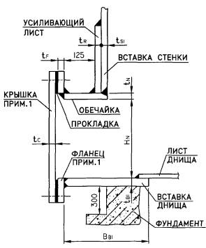 Учитывая, что окраечное кольцо основного днища не имеет сплошного опирания, как это предусмотрено разделом 8.3, толщина окраечных листов должна определяться по формуле tb + 2 мм, где tb - толщина окраек стандартного днища, вычисляемая по п. 8.3.5.
