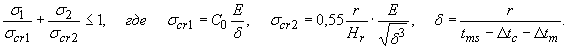 Индексы U, L относятся к параметрам поясов, примыкающих соответственно сверху и снизу к i-му стыку (рис. 9.1). Расчет производится последовательно от нижнего пояса к верхнему. При вычислении толщины первого пояса следует принять xL = 0. Допускается использовать толщины поясов tL, полученные по результатам расчета стенки на устойчивость (п. 9.2.3) и сейсмостойкость (п. 9.6). 9.2.2.4. Результаты расчета толщины t для каждого пояса стенки следует округлить до целого числа в большую сторону в соответствии с толщинами проката по ГОСТ 19903-74, если не указаны специальные условия поставки листового проката. 9.2.2.5. Пример расчета стенки резервуаров из условия прочности приведен в Приложении П.5. 9.2.2.6. По согласованию с Заказчиком допускается назначать толщины стенки резервуара на основе конечно-элементного расчета составной цилиндрической оболочки с учетом ее моментного состояния. При этом в расчетную модель должна быть включена окрайка днища, связанная с основанием односторонними связями, не сопротивляющимися отрыву днища от фундамента. Коэффициенты условий работы для поясов стенки в режиме эксплуатации принимаются в этом случае такими же, как для режима гидравлических испытаний. 9.2.3. Устойчивость стенки резервуара Расчет стенки резервуара на устойчивость выполняется в соответствии с указаниями СНиП II-23-81* и включает проверку толщин поясов стенки, необходимость установки промежуточных ветровых колец, а также назначение мест установки и сечений колец, если таковые требуются. 9.2.3.1. Критерий устойчивости стенки 9.2.3.1.1. Устойчивость стенки резервуара обеспечена при выполнении следующего условия: