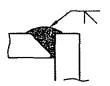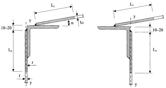 Рис. 9.3. Соединение крыши со стенкой 9.3.4.1. Каркас крыши представляет собой систему радиальных и кольцевых балок. Количество радиальных балок nr определяется по конструктивным соображениям с учетом неравенства: nr ≥ π D/1,8. Результат округляется до числа, кратного четырем. 9.3.4.2. Моделирование крыш следует производить методом конечных элементов. Расчетная схема должна включать все несущие стержневые и пластинчатые элементы, предусмотренные конструктивным решением. Если листы настила не приварены к каркасу, то в расчете учитываются только их весовые характеристики. 9.3.4.3. Модель крыши должна учитывать деформативность ее внешнего опорного контура, т.е. включать элементы уторного узла, верхний участок стенки высотой Ls и кольцевой участок настила крыши шириной Lr. При этом размеры Ls, Lr определяются по формулам 9.3.3.2.2. 9.3.4.4. Проверка несущей способности узла сопряжения крыши со стенкой производится в соответствии с требованиями п. 9.3.3.2.2. 9.3.5. Каркасные взрывозащищенные крыши 9.3.5.1. Каркасные крыши взрывозащищенного исполнения должны удовлетворять требованиям п.п. 9.3.1, 9.3.2, 9.3.4, а также быть рассчитаны на действие двух дополнительных сочетаний нагрузок (таблица П. 4.3 Приложения П.4), которые включают помимо веса конструкций и теплоизоляции, внутреннее избыточное давление с коэффициентами надежности по нагрузке 1,25 (гидро-пневмоиспытания) и 1,6 (аварийный режим). 9.3.5.2. Для взрывозащищенных крыш должны выполняться условия: а) D ≥ 15 м; б) α ≤ 9,46° (уклон крыши меньше или равен 1:6); в) крыша должна крепиться к опорному уголку односторонним угловым швом с катетом не более 5 мм; г) конструкция узла сопряжения стенки и крыши должна соответствовать одной из схем, приведенных на рис. 9.3; д) площадь сечения, выделенного на рис. 9.3, должна удовлетворять неравенству: