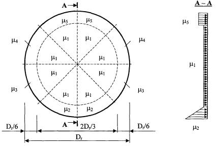 Рис. 9.8. Последовательность расчетов сейсмостойкости резервуара При этом проверка резервуара на сдвиг при землетрясении до 9 баллов включительно не требуется. 9.6.1.5. Сейсмостойкость резервуара следует считать обеспеченной при одновременном выполнении следующих условий: а) резервуар не опрокидывается при землетрясении (критерием опрокидывания является предельное состояние, при котором на внешнем радиусе приподнятой части днища возникает полный пластический шарнир, рис. 9.9); Рис. 9.9. Расчетная схема резервуара в условиях землетрясения б) обеспечена устойчивость нижнего пояса стенки от действия продольно-поперечной нагрузки; в) обеспечены условия прочности для всех несущих элементов резервуара. 9.6.1.6. Если условия 9.6.1.5а или 9.6.1.5б не выполняются, требуется установка анкеров, количество и размеры которых определяются расчетом. 9.6.2. Параметры сейсмического воздействия 9.6.2.1. Параметры сейсмического воздействия выдаются Заказчиком на основе данных сейсмического микрорайонирования площадки строительства. В районах, для которых отсутствуют карты сейсмического микрорайонирования, допускается использовать комплект карт общего сейсмического районирования территории Российской Федерации ОСР-97, или СНиП II-7-81*. 9.6.2.2. Задание на проектирование должно включать следующие параметры сейсмического воздействия: - сейсмичность площадки строительства (баллы по шкале MSK-64); - категория грунта по сейсмическим свойствам (таблица 1* СНиП II-7-81); - коэффициент вертикального сейсмического ускорения Av. 9.6.2.3. Коэффициент горизонтального сейсмического ускорения составляет Аh = 0,1, 0,2, 0,4 при землетрясении интенсивностью 7, 8, 9 баллов соответственно. Для грунтов категорий сейсмичности I или III параметр Ah задается по таблице 1* СНиП II-7-81. 9.6.2.4. Коэффициент вертикального сейсмического ускорения назначается на основе данных сейсмического микрорайонирования. Если данные отсутствуют, допускается принимать Av = 0,5Ah. 9.6.2.5. В разделе 9.6 принята система безразмерных коэффициентов, представленная в таблицах 9.8, 9.9. Таблица 9.8