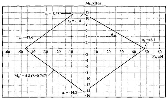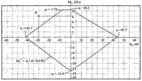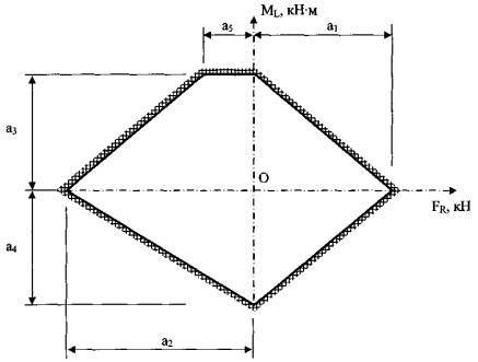 Требуется определить область допускаемых нагрузок на патрубок при любой комбинации фактических нагрузок. С этой целью принимаем набор значений MCJ* в интервале от 0 до МC0 с произвольным шагом (например, 0,2 МC0). При этом, в соответствии с таблицей П.18.2, МC0 = 19,0 кН·м, что соответствует точке с координатами FR = 0, ML = 0 на графике рис. П.18.3. Для каждого значения MCJ* вычисляем параметры a1-a5 и строим многоугольники, ограничивающие область допускаемых нагрузок (рис. П.18.3).