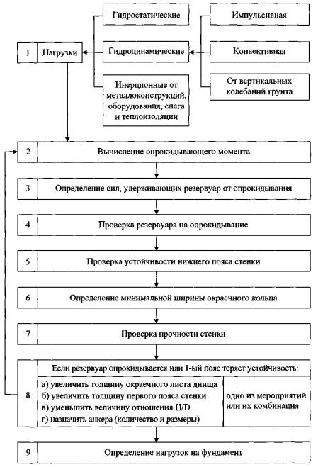 где tBI - номинальная толщина вставки днища (м); ρ - плотность продукта (т/м3), но не менее 1,0; LN - ширина обечайки (м), принимаемая по таблице 8.9; Δtcs - припуск на коррозию стенки (м). Придонные очистные люки должны изготавливаться в заводских условиях и после сварки подвергаться термообработке (снятие напряжений) в соответствии с требованиями п. 18.5. 9. Расчет конструкций резервуара9.1 Основные положенияРасчет конструкций резервуаров выполняется по методике предельных состояний в соответствии с ГОСТ 27751 - по предельным состояниям первой и второй групп. Условные обозначения и размерности используемых величин приведены в Приложении П.1. 9.1.1. Нагрузки и воздействия 9.1.1.1. В процессе строительства и в течение расчетного срока службы резервуар должен выдерживать заданные при проектировании нагрузки и воздействия. 9.1.1.2. Классификация, нормативные и расчетные значения нагрузок и воздействий, а также учет их неблагоприятных сочетаний осуществляется исходя из климатических и сейсмических условий, а также технологических особенностей эксплуатации резервуара и в соответствии со СНиП 2.01.07-85*. 9.1.1.3. Расчетное значение нагрузки следует определять как произведение ее нормативного значения на коэффициент надежности по нагрузке, соответствующий рассматриваемому предельному состоянию и принимаемый по СНиП 2.01.07-85*. 9.1.1.4. К постоянным нагрузкам относятся нагрузки от собственного веса элементов конструкций резервуаров. 9.1.1.5. К временным длительным нагрузкам относятся: - нагрузка от веса стационарного оборудования; - гидростатическое давление хранимого продукта; - избыточное внутреннее давление или относительное разряжение в газовом пространстве; - снеговые нагрузки с пониженным нормативным значением; - нагрузка от веса теплоизоляции; - температурные воздействия; - воздействия от деформаций основания, не сопровождающиеся коренным изменением структуры грунта. 9.1.1.6. К временным кратковременным нагрузкам относятся: - ветровые нагрузки; - снеговые нагрузки с полным нормативным значением; - нагрузки от веса людей, инструментов, ремонтных материалов; - нагрузки, возникающие при изготовлении, хранении, транспортировке и монтаже конструкций резервуара. 9.1.1.7. К особым нагрузкам относятся: - сейсмические воздействия; - аварийные нагрузки, связанные с нарушением технологического процесса; - воздействия от деформаций основания, сопровождающиеся коренным изменением структуры грунта; - нагрузки, возникающие в процессе стихийного бедствия. 9.1.1.8. При определении нагрузки от собственного веса элементов конструкций резервуара следует использовать значения номинальной толщины элементов t. При проверке несущей способности элементов конструкций резервуара используются значения расчетной толщины элементов (t-Δtc-Δtm). 9.1.1.9. Нагрузки и их сочетания, используемые при расчете резервуаров, приведены в Приложении П.4. 9.1.2. Учет уровня ответственности 9.1.2.1. Уровень ответственности (класс опасности) резервуаров при расчете прочности и устойчивости основных несущих конструкций должен учитываться снижением расчетного сопротивления стали на коэффициент надежности по ответственности γn, значения которого приведены в таблице 9.1.
