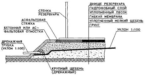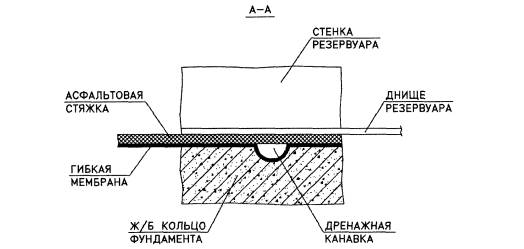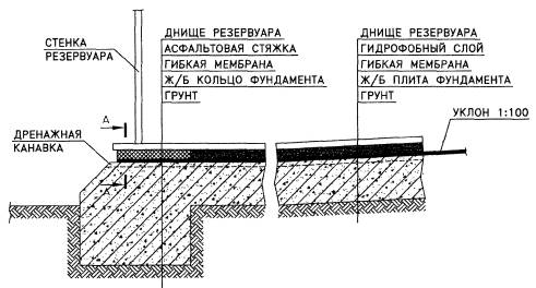 Защитное днище по периметру опирается на кольцевой железобетонный фундамент, являющийся общим фундаментом для опирания основной и защитной стенок. Центральная часть защитного днища опирается на гидрофобный слой. Герметизация пространства между основным и защитным днищами осуществляется при помощи кольцевой уплотнительной полосы, на которой устанавливаются контрольные патрубки.