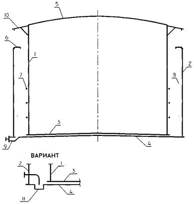 Выполненные по вариантам а) и в) основное и защитное днища могут находиться в контакте друг с другом или могут разделяться решетками или арматурными сетками, при этом пространство между днищами заполняется ингибитором коррозии. Заливка ингибитора и контроль за его уровнем осуществляются через контрольные патрубки. По уровню ингибитора в контрольном патрубке делается заключение о герметичности днищ: