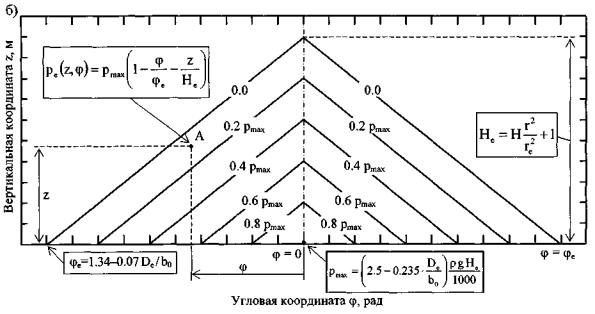 9.2.3.1.5. Кольцевые напряжения в i-ом поясе стенки следует определять по формулам: а) для резервуаров со стационарной крышей: σ2 = (0,95·1,2pv + 0,9·0,5kpw) δ. б) для резервуаров с плавающей крышей: σ2 = kpwδ, где k - коэффициент учета изменения ветрового давления по высоте стенки z, определяемый по табл. 6 СНиП 2.01.07-85*, либо, если 5 м ≤ z ≤ 40 м, по формуле: k = 0,365 ln (z) + 0,157. 9.2.3.1.6. Если Gt = 0, или pv = 0, или ps = 0 формулы 9.2.3.1.4-9.2.3.1.5 должны быть приведены в соответствие с полученным сочетанием нагрузок. 9.2.3.1.7. Коэффициент fs, учитывающий форму стационарной крыши, принимается равным: - 0,7 для купольных крыш при ρr < D, - 0,9 для купольных крыш при D ≤ ρr < 1,1D, - 1,0 для конических и прочих купольных крыш. 9.2.3.1.8. При невыполнении условия 9.2.3.1.1 для обеспечения устойчивости стенки следует увеличить толщину верхних поясов, или установить промежуточное кольцо (кольца) или то и другое вместе. При этом место установки промежуточного кольца должно обеспечивать равенство величин HrL, HrU, полученных по формуле 9.2.3.1.2 для участков стенки ниже и выше кольца, и быть не ближе 150 мм от горизонтального сварного шва. Если условие HrL = НгU обеспечить невозможно, ветровое кольцо должно быть установлено на расстоянии 150 мм ниже или выше горизонтального сварного шва, для которого разница величин HrL, HrU будет минимальной. 9.2.3.1.9. После установки промежуточного ветрового кольца, участки стенки над кольцом и под ним должны быть устойчивы, то есть должны удовлетворять условию 9.2.3.1.1. 9.2.3.1.10. Допускается расчет на устойчивость стенки резервуара выполнять по формулам, выражающим критерий устойчивости через действующие и критические значения вертикальной (осевой) нагрузки и внешнего давления: