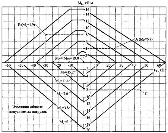 В качестве примера на рис. П.18.3 показаны точки А, В, С соответствующие комбинациям нагрузок «а», «б», «в». Расчеты показали, что: