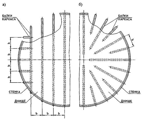 Конструктивные схемы расположения опорных балок показаны на рис. П.19.1 а и П.19.1 б. По этим вариантам стенка резервуара не имеет сплошной кольцевой опоры, поэтому в проекте КМ должны быть рассмотрены вопросы местной устойчивости стенки между опорными балками. Данные варианты опирания днищ рекомендуются для резервуаров, имеющих толщину нижнего пояса не более 14 мм и эксплуатируемых при температуре не более 100°С.