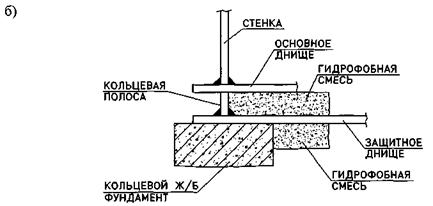 Данный вариант двойного днища предполагает опирание защитного днища на сплошное основание с кольцевым фундаментом по периметру стенки резервуара (рис. П.19.2 б).