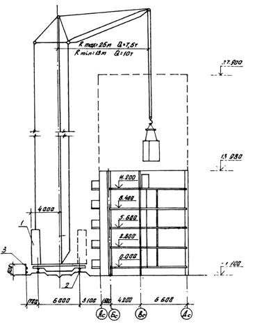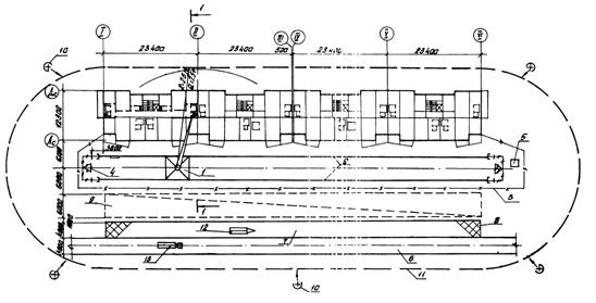 Технологическая схема выполнения строительного процесса 1 - башенный кран КБ-405.1А; 2 - подкрановый путь; 3 - ограждение подкранового пути; 4 - контур заземления; 5 - контрольный груз; 6 - временная автодорога; 7 - площадка разгрузки автотранспорта; 8 - площадка для приема раствора и бетона; 9 - временная открытая площадка складирования; 10 - прожекторы; 11 - граница зоны работы крана; 11 - полуприцеп-сантехкабиновоз; 13 - тягач Рис. 1 Рис. 2 Схема складирования сантехкабин Рис. 3 Съема строповки сантехкабин Рис. 4 Схема контроля монтажа сантехкабин Рис. 5 Схема последовательности монтажа сборных конструкций типового этажа на примере секции 90-06 1. На схеме