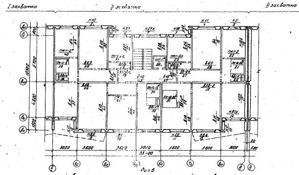 Технологическая схема выполнения строительного процесса 1 - башенный кран КБ-405.1А; 2 - подкрановый путь; 3 - ограждение подкранового пути; 4 - контур заземления; 5 - контрольный груз; 6 - прицеп-панелевоз; 7 - тягач; 8 - прожекторы; 9 - временная автодорога; 10 - площадка разгрузки автотранспорта; 11 - площадка для приема раствора; 12 - временная открытая площадка складирования; 13 - граница зоны работы крана. Рис. 1 Рис. - 2. Схема складирования вентиляционного блока 1 - вентиляционные блоки; 2 - склад-пирамида. Рис. - 3 Схема строповки вентиляционного блока 1 - траверса универсальная (четырехветвевая самобалансирная) Рис. - 4. Схема последовательности монтажа сборных конструкций типового этажа на приеме секций 90-05 Рис. - 5. Примечание: 1. На схеме последовательности монтажа конструкций цифрами в числителе указана марка, а в знаменателе - порядковый номер монтажа конструкций. 2. Конструкции, отмеченные (*), выгружают на приобъектный склад и монтируют в порядке очередности. Выверка вентиляционного блока. Схема временного крепления вентиляционного блока к стеновой панели. Рис. - 6. Схема временного крепления отдельно стоящего вентиляционного блока 1 - вентиляционный блок; 2 - деревянные клинья; 3 - плита перекрытия. Рис. - 7. 4. КАЛЬКУЛЯЦИЯ ЗАТРАТ ТРУДА, МАШИННОГО ВРЕМЕНИ И ЗАРАБОТНОЙ ПЛАТЫ НА МОНТАЖ ВЕНТИЛЯЦИОННЫХ БЛОКОВ ТИПОВОГО ЭТАЖАТаблица 3