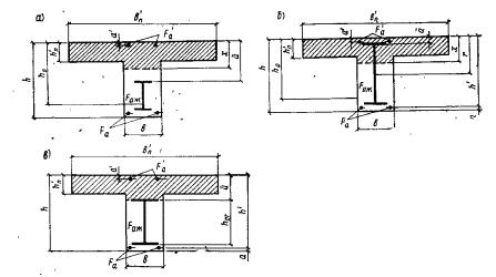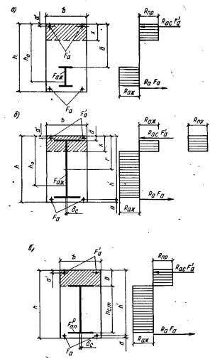 равной ширине полки б) если нейтральная ось проходит в ребре, то расчет производится с учетом сжатия в ребре, согласно пп. 3.12-3.14. Вводимая в расчет ширина полки принимается как для элементов с гибкой арматурой в соответствии с указаниями главы СНиП II-21-75. 3.12. Случай 1 (рис. 2,а). Высота сжатой зоны сечения х определяется по формуле Расчет сечения при x £ xRh0 производится из условия: Если x > xRh0, то прочность сечения проверяется из условия (10), принимая x = xRh0,. 3.13. Случай 2 (рис. 2,б). Положение нейтральной оси при симметричном профиле жесткой арматуры определяется по формуле Прочность сечения при x £ xRh0 проверяется из условия: При несимметричном профиле жесткой арматуры следует учитывать рекомендации п. 3.9.