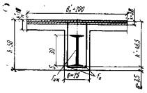 т.е. прочность сечения обеспечивается. Пример 6. Дано: размеры сечения по рис. 8; изгибающий момент М = 29 тс×м; бетон марки М 300 (Rпp = 135 кгс/см2, тб1 = 1); жесткая арматура из стали класса С 38/23 - двутавр № 30 (Rаж = 2100 кгс/см2) площадью сечения Fаж = 46,5 см2; гибкая растянутая арматура из стали класса A-III (Rа = 3400 кгс/см2) площадью сечения Fа = 6,28 см2 (2Æ20).