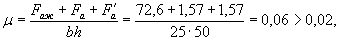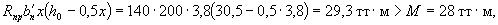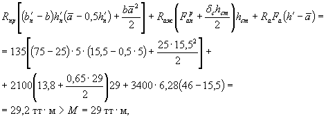 h0 = h - а1 = 50 - 19,5 = 30,5 см. Из табл. 1 имеем xR = 0,58. Так как х = 3,8 см < xRh0 = 0,58×30,5 = 17,7 см, то прочность сечения проверяем из условия (4):