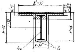 т.е. прочность сечения обеспечивается. Пример 5. Дано: размеры сечения по рис. 7; изгибающий момент М = 35 тс×м; бетон марки М 300 (Rпp = 135 кгс/см2, тб1 = 1); гибкая растянутая арматура из стали класса A-III (Rа = 3400 кгс/см2) площадью сечения Fа = 6,28 см2 (2Æ20), жесткая арматура из стали класса С 38/23 - двутавр № 40 (Rаж = 2100 кгс/см2) площадью сечения Fаж = 71,4 см2. Требуется проверить прочность сечения.