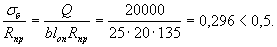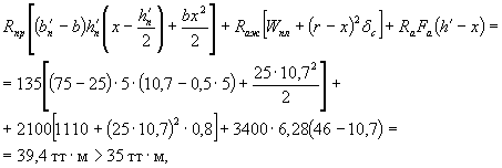 h0 = h - а1 = 50 - 14,4 = 35,6 см; 0,35Rпрbh0 = 0,35×135×25×35,6 = 42,1 т > Q = 20 т. Высота стенки двутавра равна hст = 20 - 2×0,84 = 18,3 см. Так как Rрbh0 = 10×26×35,6 = 8,9 т < Q = 20 т, а 0,8hcтdсRаж = 0,8×18,3×0,5×2100 = 15,4 т < Q = 20 т, то проверку сечения по поперечной силе производим из условия (17). Для этого определяем усилие, воспринимаемое бетоном, по формуле (18) Qб = Rрbh0 = 10×25×35,6 = 8,9 т. Усилие, воспринимаемое стенкой двутавра, равно 0,8hcтdсRаж = 0,8×18,3×0,5×2100 = 15,4 т. Так как Q = 20 т < Qб +0,8hcтdсRаж = 8,9 + 15,4 = 24,3 т, то прочность сечения по поперечной силе достаточна без учета хомутов. Расчет по изгибающему моменту Принимаем длину проекции наклонного сечения с = h = 50 см. Момент в конце наклонного сечения M = Q×с = 20×0,5 = 10 тс×м. Определяем высоту сжатой зоны бетона применительно к 1-му случаю расчета по формуле (3) исходя из полного расчетного сопротивления жесткой арматуры: