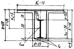 т.е. прочность сечения обеспечивается. Пример 3. Дано: размеры сечения по рис. 5; изгибающий момент М = 19 тс×м; бетон марки М 300 (Rпp = 135 кгс/см2, тб1 = 1); жесткая арматура из стали класса С 38/23 - двутавр № 30 (Rаж = 2100 кгс/см2) площадью сечения Fаж = 46,5 см2; гибкая растянутая арматура из стали класса A-III (Rа = 3400 кгс/см2) площадью сечения Fа = 1,57 см2 (2Æ10). Требуется проверить прочность сечения.