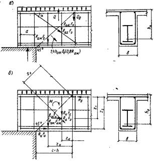 т.е. прочность сечения обеспечивается. РАСЧЕТ ПО ПРОЧНОСТИ СЕЧЕНИЙ, НАКЛОННЫХ К ПРОДОЛЬНОЙ ОСИ ИЗГИБАЕМОГО ЭЛЕМЕНТА 3.15. Расчет по прочности сечений, наклонных к продольной оси изгибаемых элементов, производится по поперечной силе я по изгибающему моменту. Расчет наклонных сечений по поперечной силе 3.16. При расчете элементов должна быть обеспечена прочность бетона на действие наклонных сжимающих усилий из условия Q £ 0,35Rпpbh0, (14) при этом значение Rпp для бетонов проектных марок по прочности выше М 400 принимается как для бетона марки М 400. 3.17. Расчет наклонных сечений по поперечной силе допускается не производить, если соблюдается одно из условий: a) Q £ Rpbh0; (15) б) Q £ 0,8hcтdсRаж. (16) В этом случае поперечная гибкая арматура определяется в соответствии с требованиями главы СНиП II-21-76. 3.18. При расчете наклонных сечений на действие поперечной силы предельные усилия определяются из следующих предпосылок: расчетное наклонное сечение принимается под углом 45° к продольной оси изгибаемого элемента; в расчет вводится вся поперечная гибкая арматура и стенка профиля жесткой арматуры, пересекаемые рассматриваемым наклонным сечением, с растягивающими напряжениями, равными соответственно расчетным сопротивлениям Rax и 0,8Rаж. При применении составных (сварных) профилей при переменной по высоте толщине стенки (утолщение в местах приварки профильной стали) в расчет вводится минимальная по высоте толщина стенки. Жесткая арматура должна иметь надежную анкеровку по концам, при которой, не может произойти среза бетона по горизонтальной плоскости над профилем. Такая анкеровка имеет месте в каркасных конструкциях, когда жесткая арматура ригеля присоединяется к жесткой арматуре колонн. На свободных же опорах балок потребуется специальная анкеровка в соответствии с рекомендациями пп. 3.23 и 5.12 настоящего Руководства; поперечное усилие в бетоне над наклонной трещиной определяется в зависимости от его расчетного сопротивления растяжению Rp, рабочей высоты и размеров сечения. 3.19. Расчет наклонных сечений элементов по поперечной силе производится в следующих местах по длине элемента: а) в сечениях, проходящих через грань опоры; б) в сечениях, проходящих через точки изменения интенсивности поперечного армирования на уровне растянутой гибкой арматуры; в) в сечениях, проходящих через расположенные в растянутой зоне начала отгибов. 3.20. Расчет наклонных сечений по поперечной силе (рис. 9,а) производится из условия: Q £ 0,8hcтdсRаж + SRaxFx + SRaxFоsina + Qб, (17) где Q - поперечная сила от внешней нагрузки, действующая в наклонном сечении, т.е., равнодействующая всех поперечных сил от внешней нагрузки, расположенных по одну сторону от рассматриваемого наклонного сечения; SRaxFx, SRaxFоsina - сумма поперечных усилий, воспринимаемых соответственно поперечной Fx и отогнутой Fо арматурой, пересекающей наклонное сечение; Fx - площадь сечения поперечных стержней (хомутов), расположенных в одной, нормальной к продольной оси элемента плоскости, пересекающей рассматриваемое наклонное сечение; Fо - площадь сечения отогнутых стержней, расположенных в одной, наклонной к продольной оси элемента плоскости, пересекающей рассматриваемое наклонное сечение; a - угол наклона отогнутых стержней к продольной оси элемента в рассматриваемом наклонном сечении; Qб - поперечное усилие, воспринимаемое бетоном в