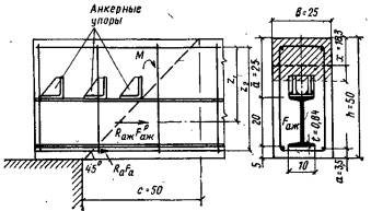 колонны б) для шарнирных узлов при анкерах в виде арматурных стержней, приваренных к жесткой арматуре ригеля (см. п. 5.12), усилие Nаж принимается равным предельному сдвигающему усилию, определенному как дли закладных деталей согласно главе СНиП II-21-75, но не более усилия, указанного в подпункте «а». При жестких упорах, приваренных к жесткой арматуре ригеля (см. п. 5.12), Nаж = FупRпр, но не более усилия, указанного в подпункте «a». Fуп - площадь жестких упоров (площадь смятия бетона). Жесткие упоры рассчитываются как металлические конструкции на давление, равномерно распределенное по площади жестких упоров и равное Rпр. Швы приварки жестких упоров к жесткой арматуре балки допускается рассчитывать только на срез. Допускается на свободных опорах балок не предусматривать анкеты, если при прямоугольном сечении балки профиль заходит в сжатую зону бетона не менее чем на половину ее высоты, а при тавровом сечении балки не менее чем на половину толщины плиты и располагается не менее чем на 5 см выше низа плиты. В этом случае усилие Nаж принимается в соответствий с подпунктом «а». Если не обеспечивается полной анкеровки гибкой продольной арматуры, то расчетное сопротивление ее принимается сниженным согласно главе СНиП II-21-76. Пример расчета РАСЧЕТ ПО ПРОЧНОСТИ СЕЧЕНИЙ, НАКЛОННЫХ К ПРОДОЛЬНОЙ ОСИ ИЗГИБАЕМОГО ЭЛЕМЕНТА Пример 7. Дано: размеры поперечного сечения шарнирно-опертой балки по рис. 10; бетон марки М 300 (Rпp = 135 кгс/см2, тб1 = 1, Rp = 10 кгс/см2); жесткая арматура из стали класса С 38/23 - двутавр № 20 (Fаж = 26,8 см2, Rаж = 2100 кгс/см2) с толщиной стенки dс = 0,5 см; гибкая продольная арматура из стали класса A-III (Rа = 3400 кгс/см2) площадью сечения Fa = l,57 см2 (Æ10) заведена за грань опоры на длину 20 см; поперечная гибкая арматура - двухветвевые хомуты из стали класса A-I (Rа = 2100 кгс/см2), диаметром 10 мм с шагом 25 см; расчетная поперечная сила на опоре Q = 20 т.