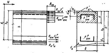Рис. 11. Схема усилий в прямоугольном сечении сжатого элемента с жесткой и гибкой арматурой, сосредоточенной у растянутой и у сжатой граней В случае симметричной жесткой и