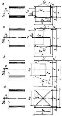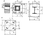 Рис. 15. Прямоугольные сечения с жесткой арматурой 3.32. Расчет прочности прямоугольных сечений элементов с жесткой арматурой, работающих на косое внецентренное сжатие, производится в общем случае согласно рекомендациям, приведенным в пп. 3.24-3.28, при этом определяется положение прямой, ограничивающей сжатую зону, при помощи последовательных приближений. 3.33. Проверку прочности при