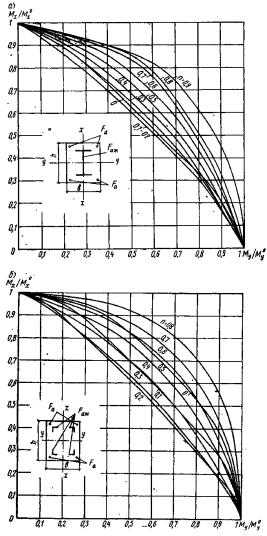 гибкой и жесткой арматурой типа двутавра при Значения Мх и Му характеризуют величины изгибающих моментов от внешней нагрузки, относительно центра тяжести сечения, действующих соответственно в плоскостях симметрии х и у. Влияние прогиба элемента учитывается путем умножения моментов Мх и Му на коэффициенты hх и hу, определяемые соответственно для плоскостей х и у согласно рекомендациям п. 3.25. Значения Значения Параметр п определяется по формуле
