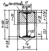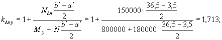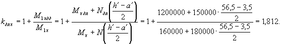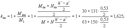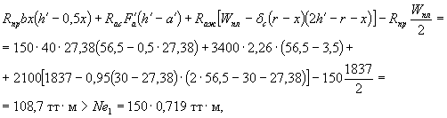 Отсюда h0 = h - а1 = 60 - 12 = 48 см. Так как х = 27,38 см < xRh0 = 0,58×48 = 27,8 см (где значение xR найдено из табл. 1), прочность сечения проверяется из условия (32) при Wпл = 1,17W = 1,17×1570 = 1837 см3,