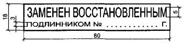 Г.2 Штамп «ЗАМЕНЕН ВОССТАНОВЛЕННЫМ ПОДЛИННИКОМ № … г.» с указанием порядкового номера восстановления подлинника и даты его восстановления ставят на подлинниках документов, с которых изготовлены восстановленные подлинники. Форма штампа приведена на рисунке Г.1.