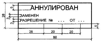 Г.3 Штамп «АННУЛИРОВАН, ЗАМЕНЕН … № … от … г.» ставят (с указанием номера, даты регистрации разрешения на внесения изменений и подписи) на аннулированных подлинниках, дубликатах и копиях, а также на карточках учета проектных документов. При отсутствии замены ставят прочерк. Форма штампа приведена на рисунке Г.2.