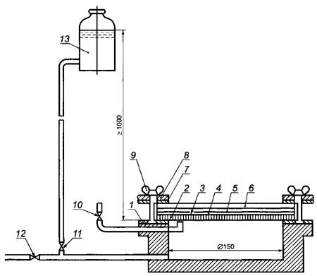 Дата введения - 2010-09-01 1 Область примененияНастоящий стандарт распространяется на кровельные и гидроизоляционные гибкие битумосодержащие и полимерные (термопластичные или эластомерные) материалы (далее - материалы) и устанавливает метод определения их водонепроницаемости, т.е. сопротивления прониканию воды при заданном давлении. Настоящий стандарт предназначен для определения характеристик материалов после их изготовления или поставки, до их укладки. Требования настоящего стандарта распространяются только на материалы и не применимы для определения характеристик изготовленных из них гидроизоляционных систем после производства работ. Настоящий стандарт может применяться при определении водонепроницаемости материалов другого назначения. 2 Нормативные ссылкиВ настоящем стандарте использована ссылка на следующий европейский стандарт: ЕН 13416:2001 Материалы гибкие гидроизоляционные - Материалы кровельные и гидроизоляционные битумосодержащие и полимерные (термопластичные или эластомерные) - Правила отбора образцов 3 Термины и определенияВ настоящем стандарте применены следующие термины с соответствующими определениями: 3.1 лицевая поверхность (upper side): Верхняя сторона полотна материала, которая является рабочей при его эксплуатации; обычно находится внутри рулона. 3.2 водонепроницаемость (watertightness): способность материала обеспечить: а) в методе А: отсутствие изменения цвета фильтровальной бумаги, находящейся над испытуемым образцом, в течение всего времени испытания при заданном давлении; b) в методе В: снижение заданного давления не более чем на 5 % от начального значения и отсутствие следов проникания воды. 4 Сущность методаВ зависимости от вида испытуемого материала используют два метода испытания: 4.1 Метод А Метод используют для материалов, предназначенных для эксплуатации в условиях низких давлений воды, например, для устройства верхних и нижних слоев кровельного ковра или пароизоляционного слоя. Образец испытывают при давлении не более 60 кПа в течение 24 ч. 4.2 Метод В Метод используют для материалов, предназначенных для эксплуатации в условиях высоких давлений воды, например, для устройства кровель специального назначения, гидроизоляции тоннелей и резервуаров. Образец материала с расположенным над ним диском с четырьмя прорезями заданных формы и размеров подвергают воздействию воды при заданном давлении в течение 24 ч, после чего оценивают водонепроницаемость образца. 5 Средства испытаний5.1 Метод А Устройство, схема которого приведена на рисунке 1, состоящее из цилиндрической металлической