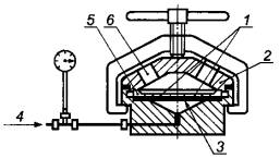 1 - прорези; 2 - крышка; 3 - образец; 4 - подача воды под заданным гидростатическим давлением; 5 - диск с прорезями; 6 - смотровое окно Рисунок 2 - Схема устройства для определения водонепроницаемости при высоких давлениях