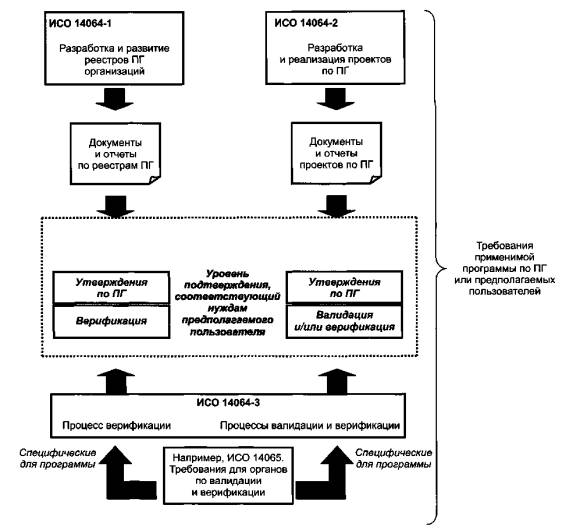 Рисунок 1 - Связь между частями комплекса стандартов ИСО 14064 c) рынки ПГ (например, покупка или продажа разрешений или кредитов по ПГ); d) требуемая отчетность (например, кредиты на ранее осуществленные действия, соглашения или национальные программы по отчетности). Стандартизованный подход к количественной оценке, мониторингу и составлению документации необходим для использования в проектах по ПГ и во всех вытекающих из него сокращениях выбросов ПГ и/или повышениях уровня их удаления для того, чтобы они были сопоставимы для всех предназначенных пользователей и программ по ПГ. Настоящий стандарт определяет общие, не зависящие от программ рамки, и использует термины и концепции, разработанные для сопоставления с другими требованиями и руководствами соответствующих политик и программ по ПГ, общепринятых (надлежащих) практик, законодательных актов и стандартов. Пример руководства по общепринятой (надлежащей) практике приведен в [13]. Настоящий стандарт является дополнением комплекса стандартов ИСО 14064, так как в нем установлены требования, чтобы проект по ПГ приводил к сокращению выбросов и/или увеличению удаления ПГ, происходящим в отсутствии проекта. При этом при установлении базовых процедур или дополнительных критериев условие «дополнительности» не используется. В настоящем стандарте установлены требования к инициаторам проекта по определению и выбору источников выбросов ПГ, поглотителей и накопителей, имеющих отношение к проекту по ПГ и базовому сценарию. Для обеспечения возможности сравнения проекта с широким кругом программ по ПГ в настоящем стандарте также не используется термин «границы», обычно применяемый для описания того, какие источники выбросов ПГ, поглотители и накопители рассматриваются для количественной оценки, мониторинга и отчетности. Вместо этого в настоящем стандарте используется концепция подходящих источников выбросов ПГ, поглотителей и/или накопителей. Таким образом, инициаторы проекта по ПГ могут применять дополнительные критерии и процедуры или определять и использовать границы, совместимые с соответствующим законодательством, стратегией, программами по ПГ и общепринятой практикой. Количественная оценка и мониторинг на этапе проектирования источников выбросов и удаления ПГ, сокращения выбросов и увеличения удаления ПГ являются многообещающими, поскольку реальные характеристики проекта оцениваются по отношению к базовому сценарию, который представляет собой сценарий того, что могло бы случиться при отсутствии данного проекта. Трудно точно установить сокращение выбросов и/или повышения удаления ПГ по базовому сценарию. Поэтому важно продемонстрировать, что базовый сценарий сопоставим с принципами настоящего стандарта, включая принципы консервативности и точности для повышения уверенности в том, что данные о сокращении выбросов и/или увеличении удаления ПГ заслуживают доверия и не завышены. В общем случае базовый сценарий определяют на основе оценки альтернативных сценариев. Для проекта и базового сценария количественная оценка, мониторинг и отчетность по выбросам, удалению и/или хранению ПГ источниками, поглотителями и накопителями основывается на процедурах, разработанных инициатором проекта или принятых соответствующими органами. Настоящий стандарт не устанавл