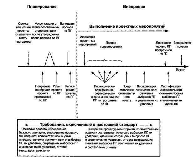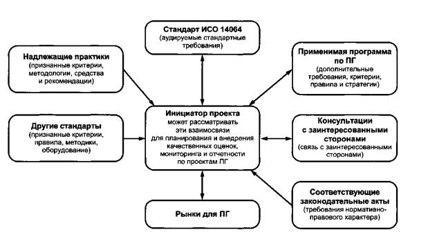 Рисунок 2 - Типичный цикл проекта по ПГ Примечание 1 - Не все программы по ПГ требуют включения всех элементов, показанных на рисунке 2. Примечание 2 - Единица ПГ - это единица, используемая для учета парниковых газов. В проектах по ПГ используют такие общеупотребительные единицы ПГ, как сертифицированные сокращения выбросов ПГ (ССВ) и увеличения удаления ПГ (СУУ), объемы кредитований и квот, обычно выражаемые в тоннах эквивалента по СO2. Инициаторы реализации проекта по ПГ могут сначала определить концепцию проекта, разработать его и оценить осуществимость проекта, провести консультации с заинтересованными сторонами и определить приемлемость требований к конкретной программе по ПГ. Целью инициатора проекта должно быть получение письменного одобрения проекта со стороны соответствующих программ по ПГ или государственных органов. На стадии проектирования настоящий стандарт устанавливает требования к утверждению и документированию проекта по ПГ. При планировании проекта по ПГ инициатор проекта должен: - составить описание проекта; - определить и выбрать источники, поглотители и накопители ПГ, имеющие отношение к проекту; - определить базовый сценарий и - разработать процедуры количественной оценки, мониторинга и отчетности в отношении выбросов, удалений, сокращения выбросов и увеличения удалений ПГ. Программы по ПГ могут потребовать проведения официальной регистрации, проверки и общественного обсуждения планов проектов по ПГ до их внедрения. На стадии внедрения настоящий стандарт устанавливает требования к выбору и применению критериев и проведению на постоянной основе процедур менеджмента качества данных, мониторинга, количественных оценок и отчетности в отношении выбросов, удаления, сокращения выбросов и увеличения удаления ПГ. Внедрение проекта по ПГ может быть инициировано определенными действиями (например, действиями по вводу в эксплуатацию, внедрению, резервированию или другим начальным операциям) и заканчиваться определенными заключительными действиями (например, мероприятиями по завершению, закрытию, выводу из эксплуатации или формальным завершением проекта). Период отчетности и периодичность предоставления отчетов может изменяться в зависимости от специфических требований к проекту или программе по ПГ. Основанные на реальных данных и информации, подвергающейся мониторингу и собираемой в период внедрения проекта, количественные оценки выбросов ПГ, удаления, сокращения выбросов и увеличения удалений могут быть верифицированы. Инициатор проекта может представлять проверенные данные о сокращении выбросов ПГ и увеличении их удаления в программу по ПГ для формирования общепризнанных единиц ПГ в рамках программы по ПГ. Настоящий стандарт не распространяется на сертификацию и признание единиц ПГ (например, объемов кредитования). Для широкого и гибкого применения проектов по ПГ различных типов и масштабов в настоящем стандарте установлены принципы и специальные требования к процессам, а не используемые специальные критерии и процедуры. Таким образом, как показано на рисунке 3, дополнительные требования, критерии и руководства соответствующих законодательных актов, программ по ПГ, общепринятых практик и стандартов приобретают большое значение для правильного применения требований настоящего 