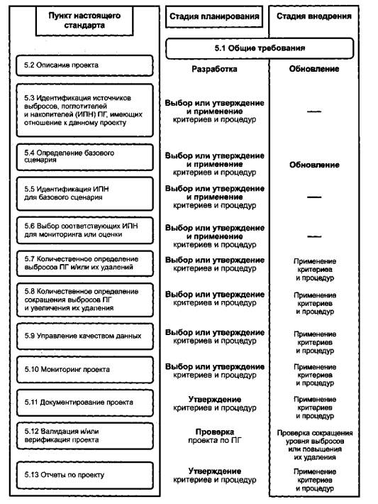 Рисунок 4 - Взаимосвязь между требованиями проектам по ПГ на стадиях планирования и внедрения 5 Требования к проектам по парниковым газам5.1 Общие требованияИнициатор проекта по ПГ должен гарантировать его соответствие определенным требованиям, предъявляемым к программе по ПГ, к которой он имеет отношение, включая критерии применимости или одобрения, соответствующие законодательные акты или другие требования. Инициатор проекта должен идентифицировать, рассмотреть и использовать проверенные на практике руководства по применению общепринятых (надлежащих) добросовестных практик, а также выбирать и применять установленные критерии и процедуры из числа общепризнанных источников (в случае их наличия) в качестве соответствующих руководств по этим практикам. В случаях, когда инициатор проекта использует критерии и процедуры из проверенных на практике руководств по общепринятым практикам, полученных из общепризнанных источников, он должен документально обосновать любые отклонения от этих критериев и процедур. В случае, если существует несколько источников для руководств по общепринятым (надлежащим) практикам, инициатор проекта должен документально обосновать причины использования выбранного источника. При отсутствии необходимых руководств по общепринятым практикам из общепризнанных источников, инициатор проекта должен установить, обосновать и применять критерии и процедуры для выполнения требований настоящего стандарта. 5.2 Описание проектаИнициатор проекта должен изложить проект и его основные положения в плане проекта по ПГ, который должен включать в себя следующее: а) наименование проекта, его назначения и цели; b) тип проекта по ПГ; c) место выполнения проекта, включая географическую и физическую информацию о нем, позволяющую однозначно идентифицировать и определить масштаб проекта; d) условия, существовавшие до выполнения проекта по ПГ; e) описание предполагаемого способа сокращения выбросов ПГ или увеличения их удаления; f) технологии, продукции и услуги для реализации проекта и ожидаемый объем деятельности; g) совокупное сокращение выбросов ПГ и увеличение их удаления, указанные в тоннах СO2-эквивалента, ожидаемое в результате выполнения данного проекта по ПГ; h) идентификацию рисков, которые могут оказать существенное влияние на проектируемое сокращение выбросов ПГ и увеличение их удаления; i) роли и ответственность, включая контактную информацию об инициаторах проекта, других участников проекта, соответствующих регулирующих государственных органах и/или администраторах какой-либо программы по ПГ, к которой относится данный проект; j) любую информацию, имеющую отношение к применимости проекта по ПГ в рамках программы по ПГ, и количественная оценка сокращения выбросов или увеличения их удаления, включая нормативно-правовую, техническую, экономическую, отраслевую, социальную, экологическую, географическую, местную и временную информацию; к) оценку суммарного экологического воздействия, если данная оценка требуется в соответствии с применяемыми нормативными правовыми и нормативными актами; l) результаты соответствующих переговоров с заинтересованными сторонами и механизмы действующих связей; m) календарный план с начала выполнения проекта до его окончания, частоту мониторинга и отчетности, а такж