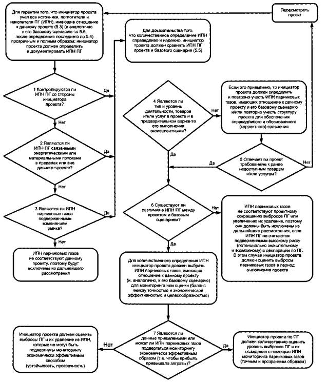 Пример схемы «древа решений», иллюстрирующей процедуру рассмотрения инициатором проекта источников, поглотителей и накопителей ПГ, предназначенный помочь инициатору проекта при выполнении требований и документировании в соответствии с требованиями настоящего стандарта, приведен на рисунке А.2. Схема, приведенная на рисунке А.2, может быть использована для определения и выбора источников поглотителей и накопителей (ИПН) ПГ с целью оценки, постоянного мониторинга и количественного определения выбрасываемых и удаляемых ПГ. Критерии, используемые в этой процедуре инициатором проекта, должны быть совместимы с принципами проекта по ПГ, руководством по общепринятой практике, политиками и правилами применимых программ по ПГ, а также с другими источниками.