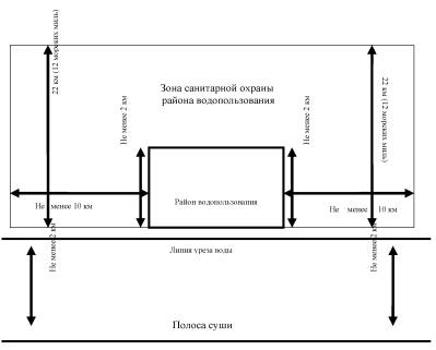 Примечание: * Допускается изменение длины глубоководных выпусков только в сторону увеличения их длины по результатам расчетов рассеивания и распространения загрязнения при сбросе сточных вод 4.8. В зоне санитарной охраны района водопользования запрещается: 4.8.1. сброс всех видов неочищенных и необеззараженных сточных вод; 4.8.2. захоронение химических веществ и загрязненных донных отложений и грунтов, полученных в результате дноуглубительных работ; 4.8.3. сброс пульп, кубовых остатков и осадков, образующихся в результате обезвреживания сточных вод, а также эксплуатации судов; 4.8.4. сброс сточных вод, в том числе очищенных и обеззараженных: а) если они содержат вещества, на которые не установлены гигиенические нормативы (ПДК или ОДУ) и для которых нет методов аналитического контроля; б) которые могут быть исключены из системы водоотведения путем рациональной технологии или использования в системах оборотного водоснабжения; в) содержащих производственное сырье, реагенты, полупродукты или конечные продукты производства, ценные отходы, которые могут быть утилизированы на данном или других объектах; г) содержащих возбудителей инфекционных и паразитарных заболеваний; д) образующихся при бурении скважин для добычи нефти и газа, эксплуатации платформ и судов, за исключением сточных вод, прошедших очистку и обеззараживание на судовых установках до нормативов допустимого сброса. Сброс должен производиться при движении судна относительно воды со скоростью не менее 4-х узлов и не приводить к появлению видимых плавающих веществ и изменению цвета воды. е) содержание вредных веществ, в которых превышает установленные для данного вида стоков нормативы допустимого сброса. 4.9. В двухкилометровой полосе суши охраняемых районов запрещается: 4.9.1. применение ядохимикатов при обработке сельскохозяйственных, лесных и других угодий; 4.9.2. строительство складов для хранения химических веществ, включая ядохимикаты, минеральные удобрения, горюче-смазочных материалов, устройство взлетно-посадочных площадок для сельскохозяйственной авиации, а также других объектов и сооружений, оказывающих влияние на качество прибрежных вод; 4.9.3. устройство полигонов бытовых и не утилизируемых отходов промышленных предприятий и накопителей сточных вод, строительство животноводческих и птицеводческих ферм и комплексов; 4.9.4. устройство полей ассенизации, запахивания или создание других сооружений для приема и обеззараживания жидких отбросов; 4.9.5. устройство полей фильтрации и полей орошения. 4.10. Выбор трассы, инженерно-технических и технологических решений расположения глубоководных выпусков, а также при расчете степени разбавления сточных вод в прибрежной зоне моря необходимо проводить с учетом наихудших показателей качества морской воды в период максимального водопользования. 4.11. При совпадении границ континентального шельфа с границами охраняемых районов требования к составу и свойствам морской воды над шельфом должны отвечать требованиям настоящих санитарных правил. V. Требования к организации надзора и контроля за безопасностью морской воды в охраняемых районах5.1. В соответствии с требованиями настоящих санитарных правил должен осуществляться государственный санитарно-эпидемиологический надзор, а также производственный, включая лабораторн