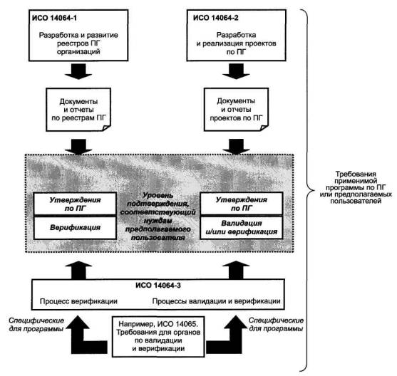 Рисунок 1 - Связь между частями комплекса стандартов ИСО 14064 Комплекс стандартов ИСО 14064 разработан с целью помочь организациям, правительствам, инициаторам проектов и всем заинтересованным сторонам во всем мире получить выгоду путем обеспечения понимания и согласованности при количественном определении, мониторинге, составлении отчетов, а также валидации или верификации реестров или проектов по ПГ. Использование комплекса стандартов ИСО 14064 может принести следующую пользу: - повысить экологическую целостность количественного определения ПГ; - повысить доверительность, согласованность и прозрачность количественного определения, мониторинга и отчетности о ПГ, включая снижение выбросов и увеличение удаления ПГ в рамках проектов; - способствовать разработке и реализации стратегий и планов организаций по управлению ПГ; - способствовать разработке и реализации проектов по ПГ; - способствовать возможности отслеживать показательность (результативность), а также способствовать прогрессу в уменьшении выбросов и/или увеличении удаления ПГ; - способствовать кредитованию и торговле снижениями выбросов или увеличением удаления ПГ. Пользователи комплекса стандартов ИСО 14064 могут получить выгоду, применяя некоторые из нижеприведенных вариантов их использования: a) корпоративный менеджмент риска (например, выявление и менеджмент рисков и возможностей); b) добровольные инициативы (например, участие в добровольной регистрации реестров или отчетности по ПГ); c) рынки ПГ (например, покупка или продажа разрешений или кредитов по ПГ); d) требуемая отчетность (например, кредиты на ранее осуществленные действия, соглашения или национальные программы по отчетности). Настоящий стандарт включает в себя многие понятия и требования, изложенные в [4]. Пользователям настоящего стандарта рекомендуется использовать информацию, изложенную в [4], для получения дополнительных рекомендаций по применению соответствующих понятий и требований. ГОСТ Р ИСО 14064-1-2007 НАЦИОНАЛЬНЫЙ СТАНДАРТ РОССИЙСКОЙ ФЕДЕРАЦИИ ГАЗЫ ПАРНИКОВЫЕ Часть 1 Требования и руководство по